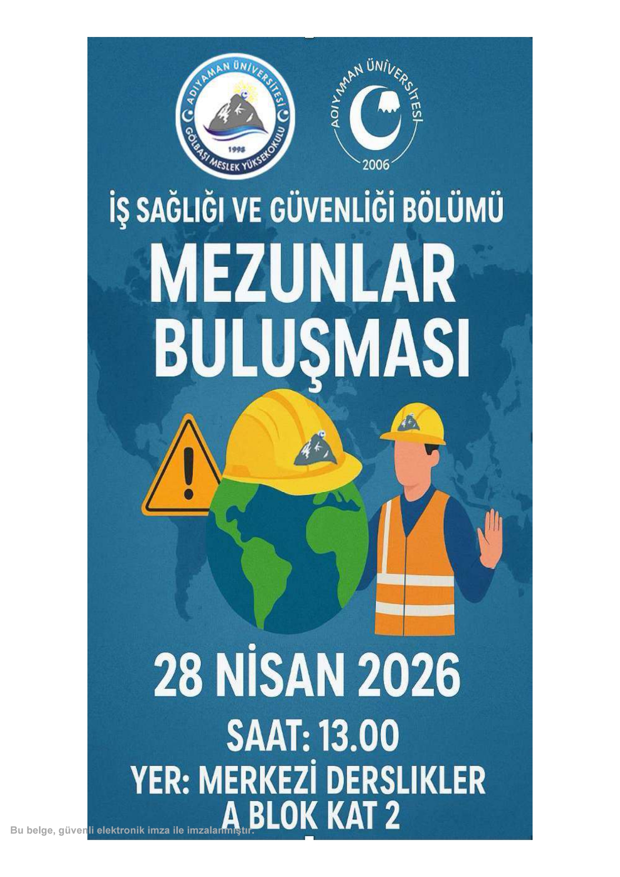 Dünya İş Sağlığı ve Güvenliği Günü kapsamında düzenlenen bu anlamlı buluşmaya tüm mezunlarımız davetlidir. Mesleki deneyimlerin paylaşılacağı, sektördeki güncel gelişmelerin konuşulacağı etkinliğimizde sizleri de aramızda görmekten mutluluk duyarız.