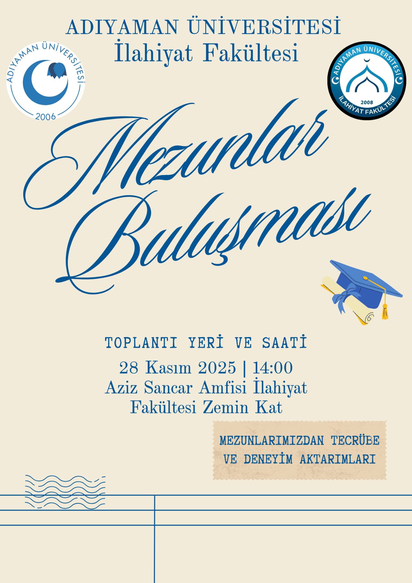 Adıyaman Üniversitesi İlahiyat Fakültesi tarafından düzenlenen “Mezunlar Buluşması” etkinliği kapsamında, mezunlarımız ile öğrencilerimiz bir araya gelerek mesleki tecrübe ve deneyim paylaşımında bulunacaktır.